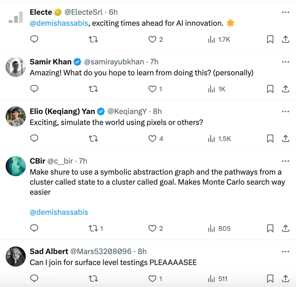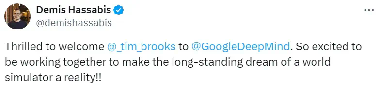 而 Tim Brooks 入职谷歌 DeepMind 后的新任务,就是这个方向。早在 DeepMind 联合创始人 Demis Hassabis 致的欢迎词中就剧透过这一点,他们要将「