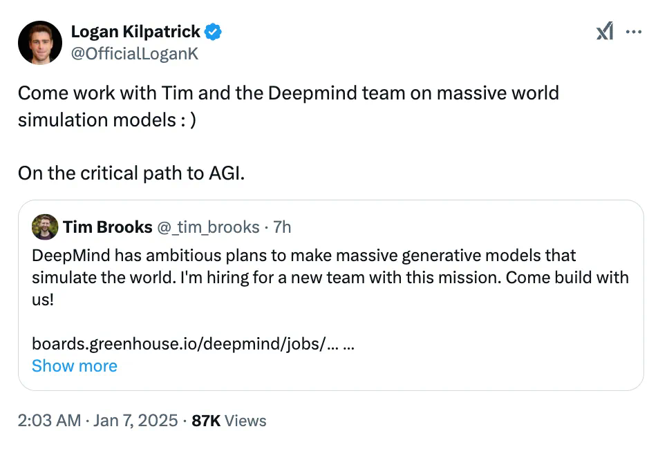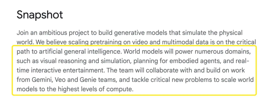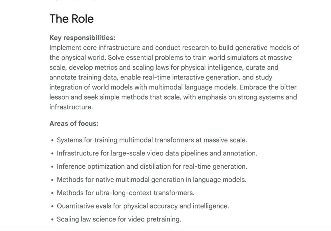 根据这个帖子中所附链接的招聘信息,这个新团队将与谷歌的 Gemini、Veo 和 Genie 团队合作,并在他们的工作基础上,解决「关键性的新问题」,并将模型扩展到「最高计算水平」。