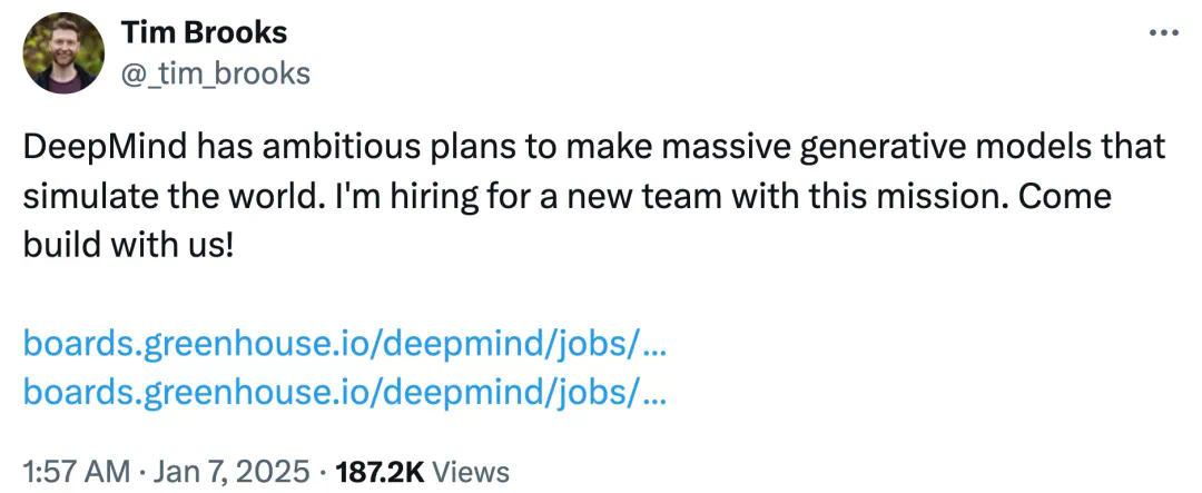 本周一,Tim Brooks 在 X 上宣布:「DeepMind 有雄心勃勃的计划,要打造能够模拟世界的大规模生成模型。我正在为这个使命组建一个新团队。」