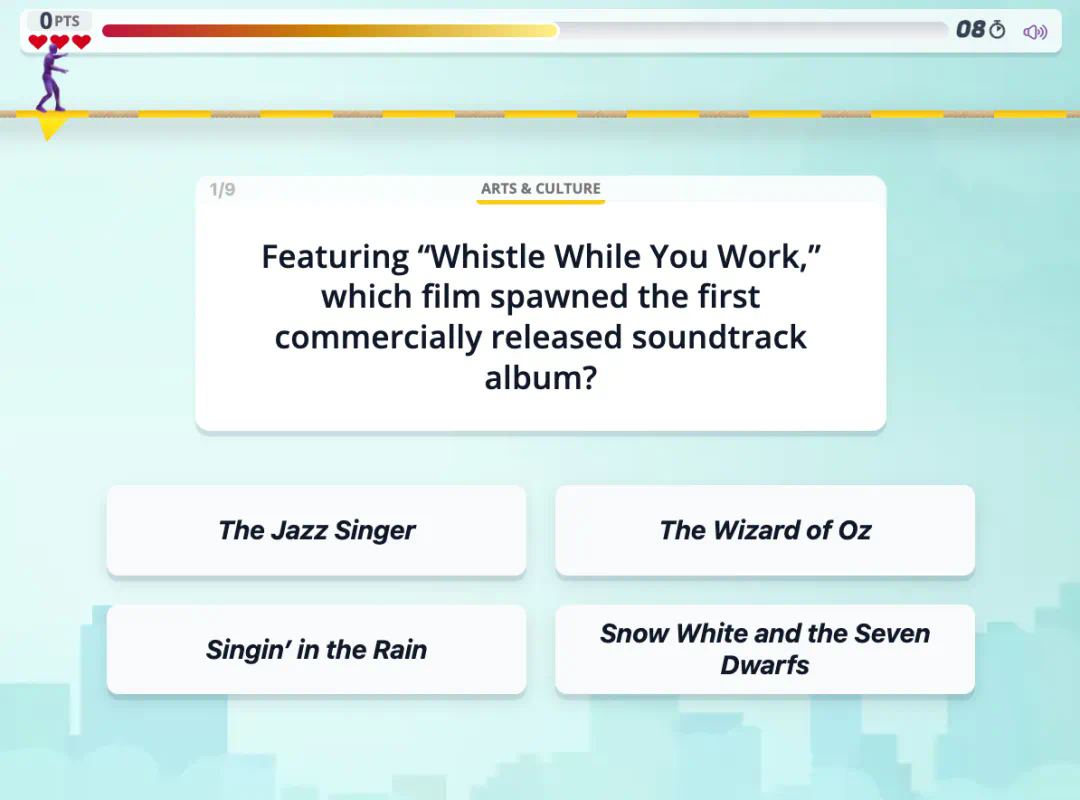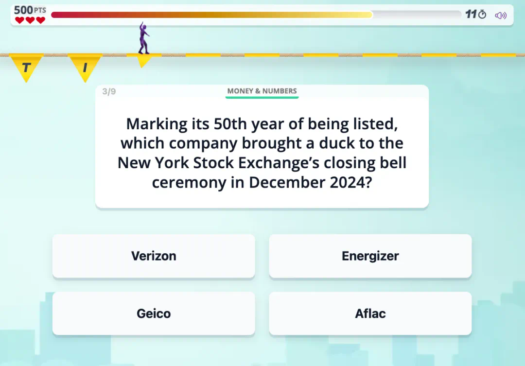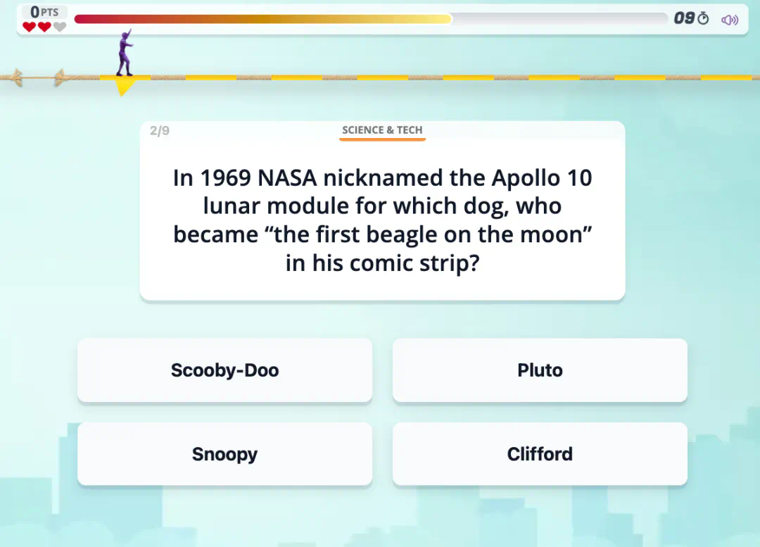 我们就以 Tightrope 为例。该游戏有 9 个有趣的问题,用户需要在 15 秒内做出回答,答错三个就输了。