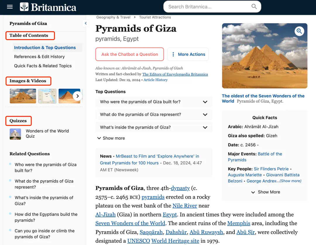 点击其中一个资料来源,就能自动跳转到大英百科全书的页面,上面涵盖「吉萨金字塔」的简介、热门问题、参考文献、视频图片以及小测验。