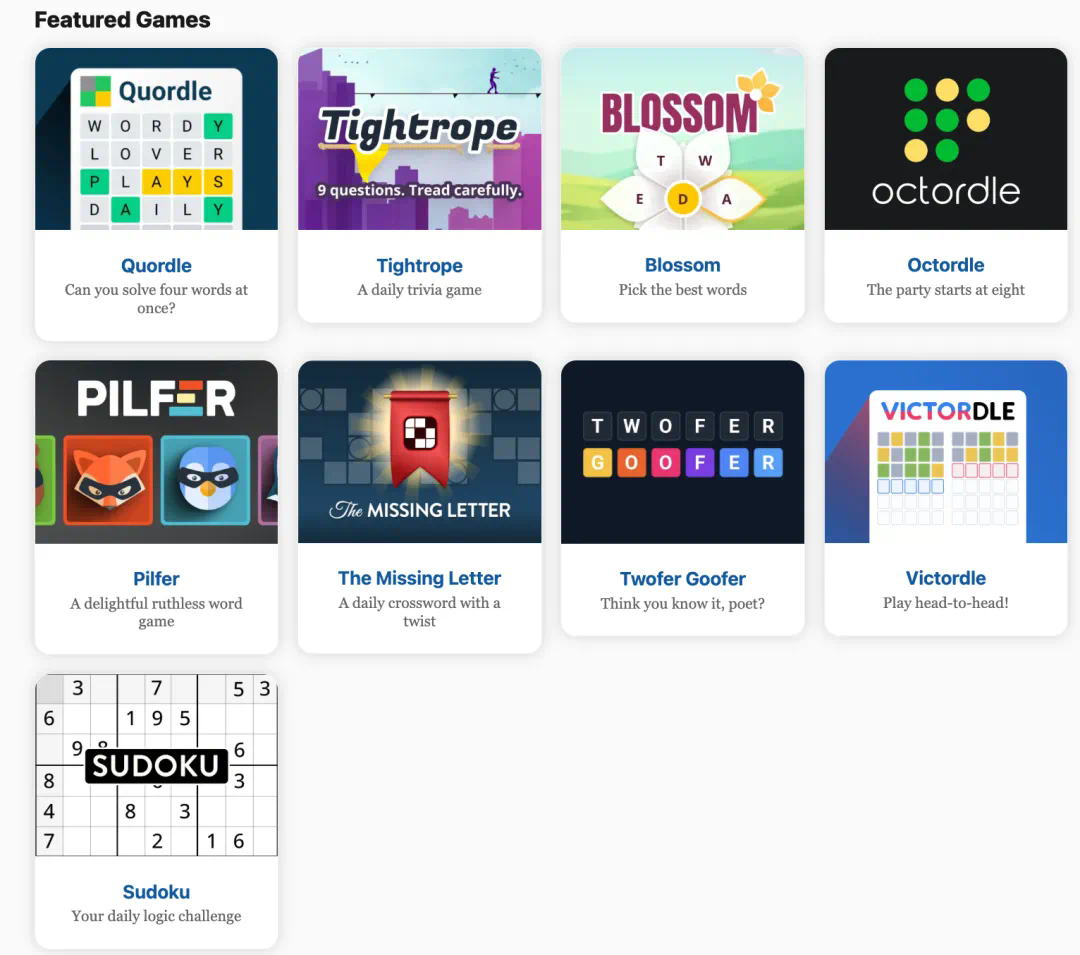 它收录了不少特色游戏,包括 Quordle(一次解出四个单词)、Tightrope (每日问答游戏)、The Missing Letter (填字游戏)以及 Sudoku (数独)等。