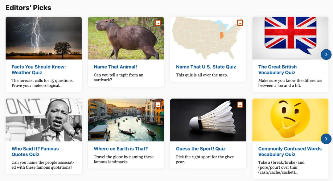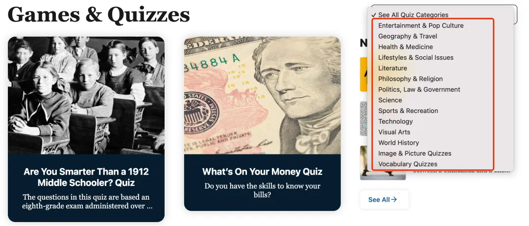 除了聊天机器人外,大英百科全书官网还有不少好玩的功能,比如 Games & Quizzes(游戏和测验)。