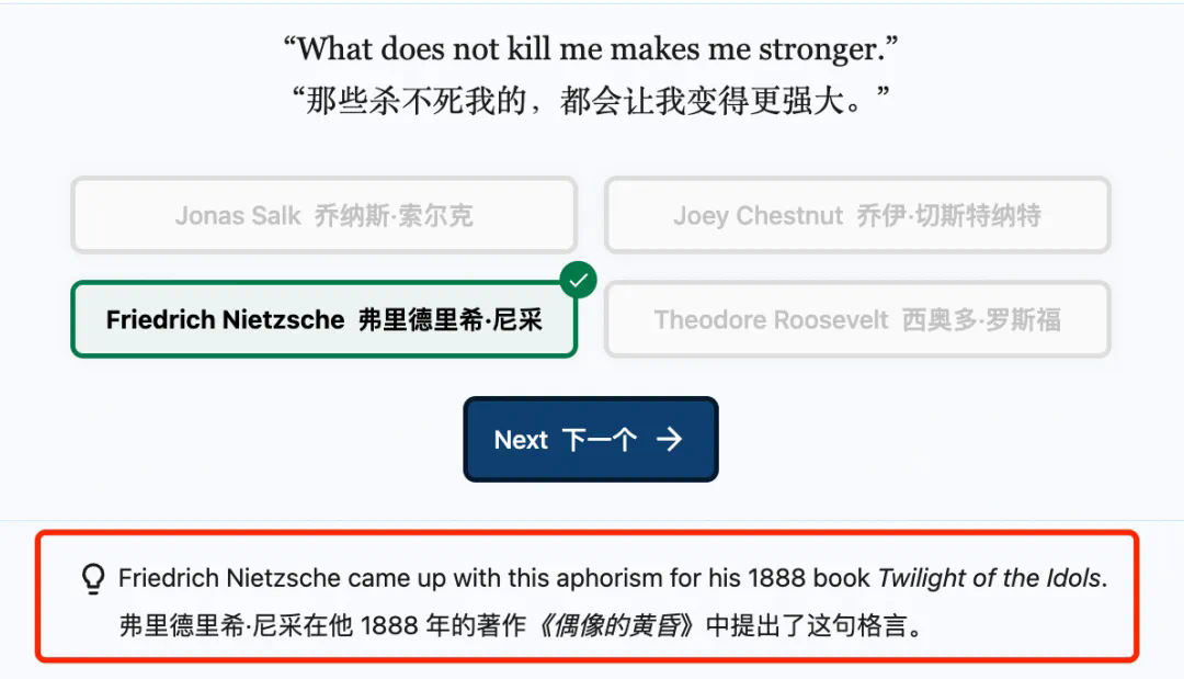 每回答完一道题目,它就自动在下方给出这句名言的背景。