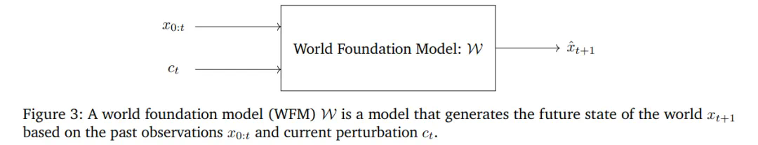 。在示例中,𝑥_0:𝑡 是 RGB 视频,而 𝑐_𝑡 是一种可以采取多种形式的扰动。它可以是物理 AI 采取的动作、随机扰动、扰动的文本描述等。