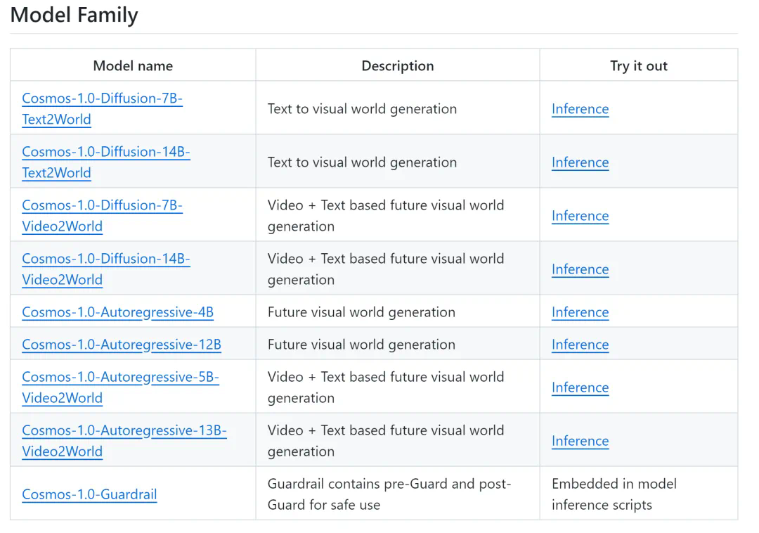 Hugging Face:https://huggingface.co/collections/nvidia/cosmos-6751e884dc10e013a0a0d8e6