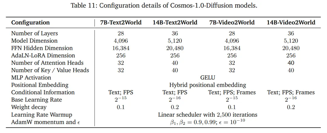 对于基于扩散的 WFM,预训练包括两个步骤:1)Text2World 生成的预训练,以及 2)Video2World 生成的预训练;