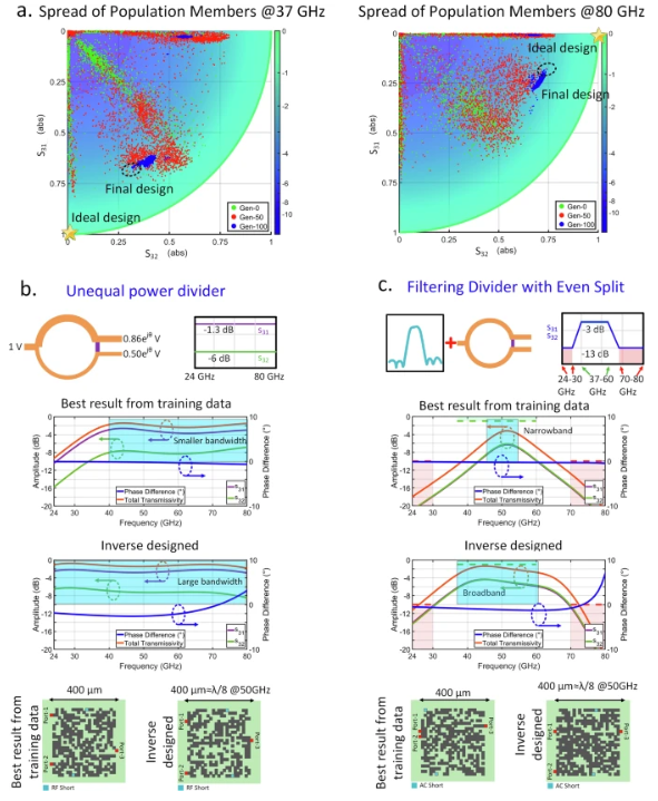 除了多端口电磁结构的逆向综合,团队还演示了初始结构如何演变为最终结构以接近所需的性能。在本次演示中可以观察到,最初大多数人口是随机分布的,随着世代的进化,结构向目标点移动,最终接近所需的性能。