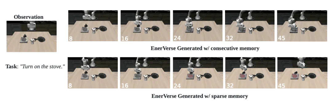 在长程生成任务中,EnerVerse 展现出更强的逻辑一致性与连续生成能力,这是现有模型无法实现的。