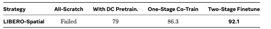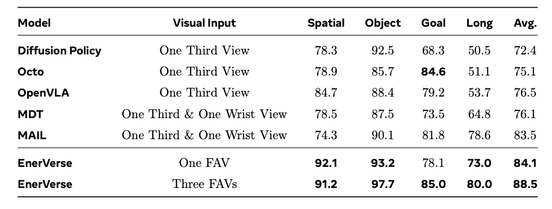 单视角(one FAV)设定:EnerVerse 在 LIBERO 四类任务中的平均成功率已超过现有方法。 -