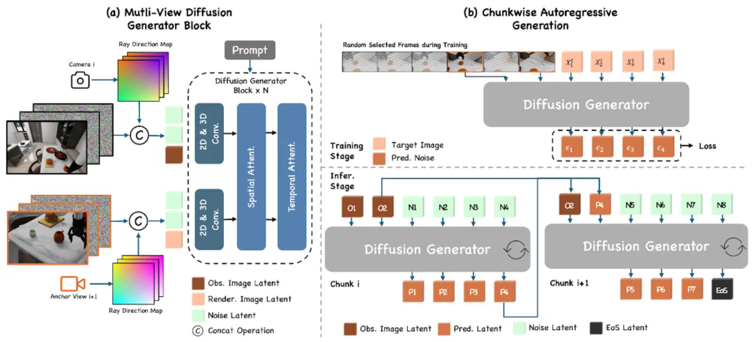 扩散模型架构:基于结合时空注意力的 UNet 结构,每个空间块内部通过卷积与双向注意力建模;块与块之间通过单向因果逻辑(causal logic)保持时间一致性,从而确保生成序列的逻辑合理性。 -