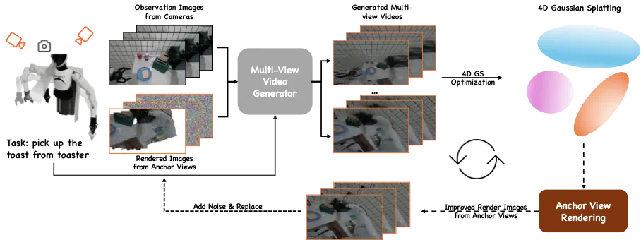 Sim2Real 适配:通过在仿真数据上训练的 4D 生成模型(EnerVerse-D)与 4D 高斯泼溅 (4D Gaussian Splatting) 交替迭代,EnerVerse 构建了一个数据飞轮,为真实场景下的 FAV 生成提供伪真值支持。
