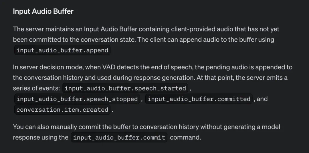 OpenAI 在服务器端维护了一个音频缓冲区,应用程序可以通过发送 input_audio_buffer.append 事件持续地添加音频帧。在自动轮次检测模式下,应用程序只需持续发送音频数据,依靠 OpenAI 服务器端的 VAD 来识别用户何时开始和停止说话。