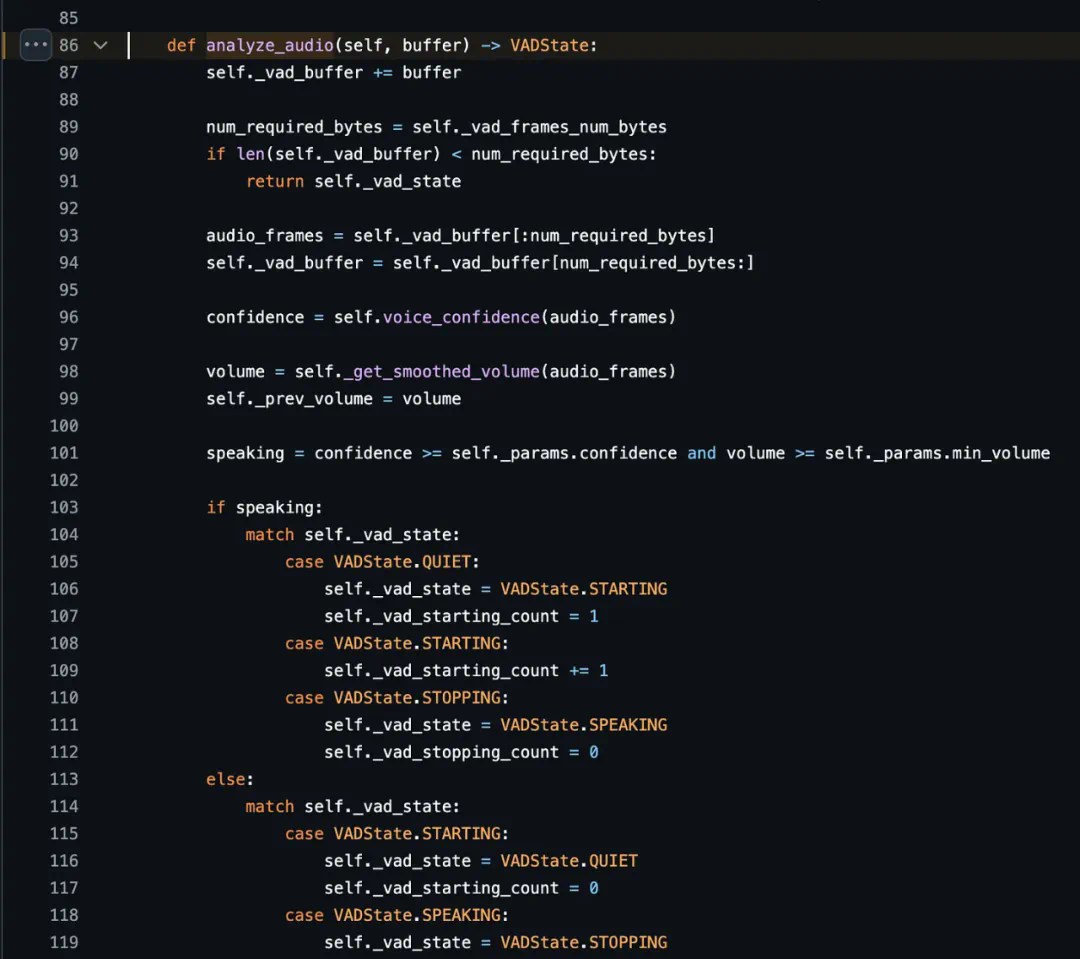https://github.com/pipecat-ai/pipecat/blob/1d4be0139aeff2ee8cc214c81ae00e5948e35977/src/pipecat/audio/vad/vad_analyzer.py#L86