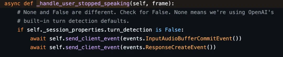 禁用 OpenAI 的自动轮次检测功能后,客户端需在用户语音回合结束时发送两个 Realtime API 事件:input_audio_buffer.commit 和 response.create。
