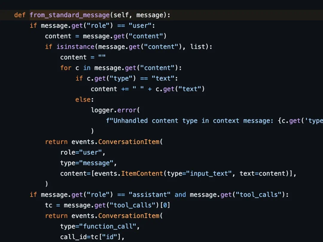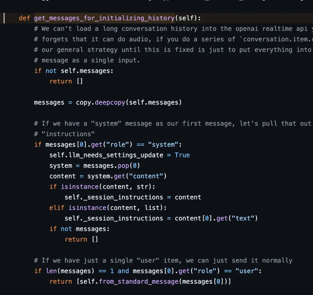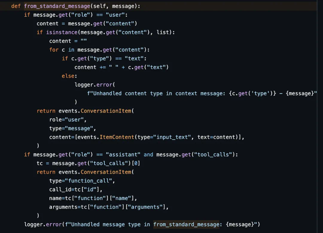 最后,请注意 Realtime API 消息的内容格式与 OpenAI HTTP API 的格式不同。以下是从 HTTP API 格式转换为 Realtime API 格式的 Pipecat 代码: