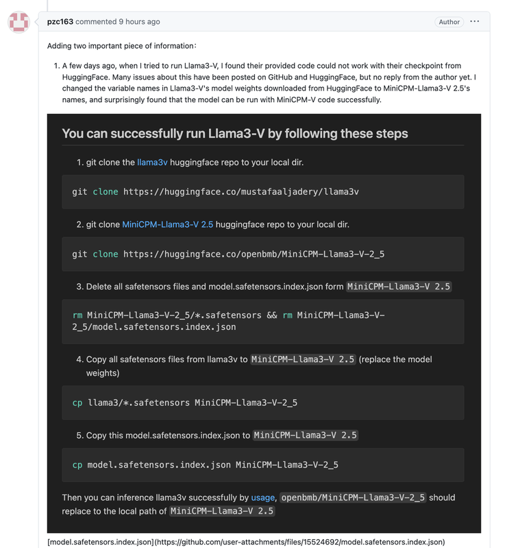 戏剧效果拉满的是,该网友随后贴出了如何使用 MiniCPM-Llama3-V 的代码,跑通 Llama3V 模型推理的详细步骤。