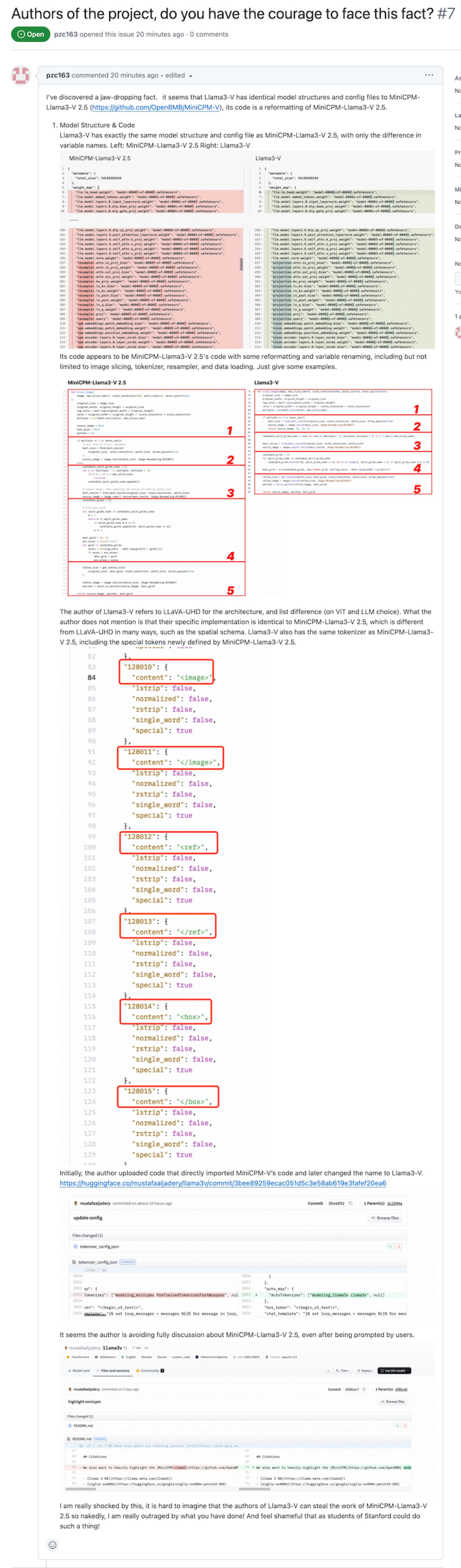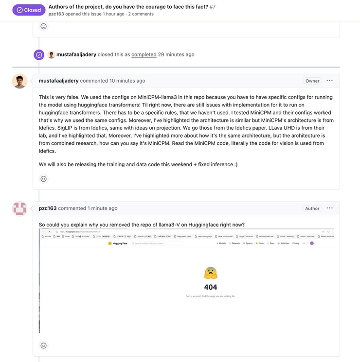 不过,好心网友对 Llama3V 作者团队的回应并不买单,而是在 Llama3V 的 Github Issue 上发布了一系列质疑,列举具体 4 点证据,但很快被 Llama3V 的团队删除。幸好作者事先截了图保留: