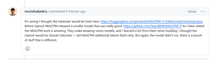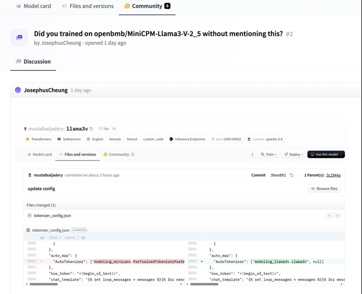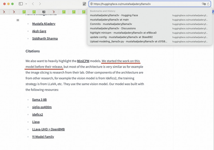 对此,Llama3V 团队回复,他们「只是使用了 MiniCPM-Llama3-V 2.5 的 tokenizer」,并宣称「在 MiniCPM-Llama3-V 2.5 发布前就开始了这项工作」。