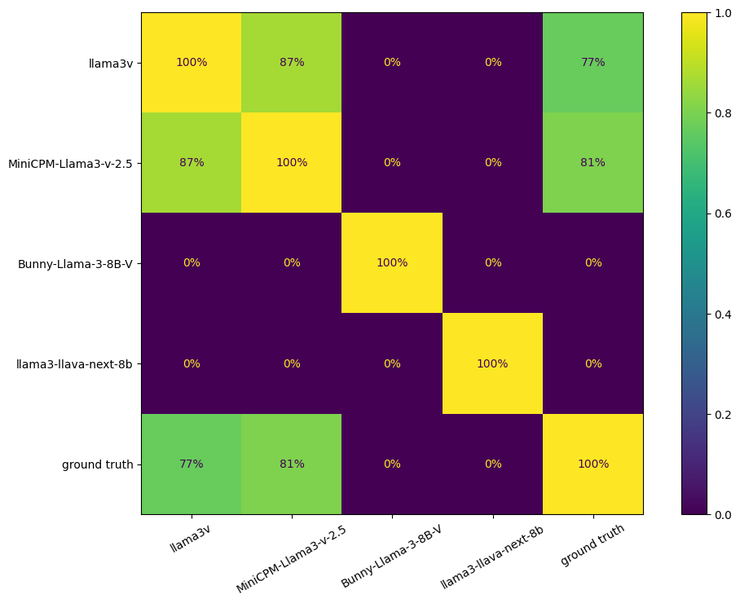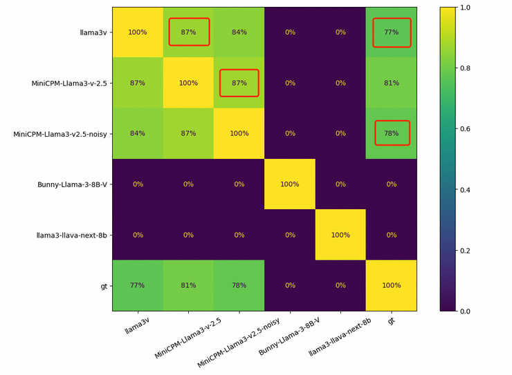 可以看到,Llama3V 与 MiniCPM-Llama3-V 2.5 的重叠高达 87%,且两个模型的错误分布律高度相似:Llama3V 的错误率为 236,MiniCPM-Llama3-V 2.5 的错误率是 194,两个模型在 182 个错误识别上相同。