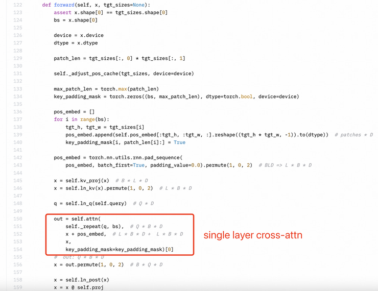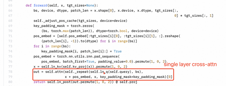 而 MiniCPM-Llama3-V 2.5 和 Llama3V 代码如下,体现的却是单层交叉注意力机制: