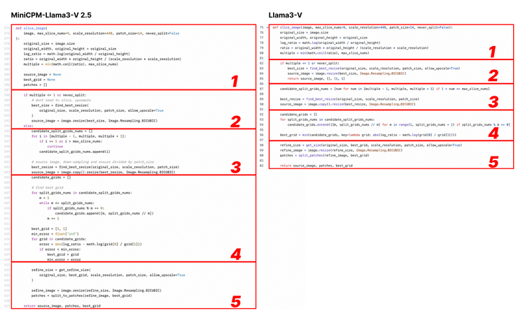 Llama3-V 的代码是通过对 MiniCPM-Llama3-V 2.5 的代码进行格式调整和变量重命名得到的,包括但不限于图像切片方式、tokenizer、重采样器和数据加载: