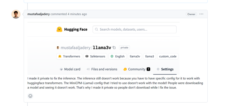 作者回应删除 Hugging Face 仓库的原因是「修复模型的推理问题」,并称他们「尝试使用 MiniCPM-Llama3 的配置,但并没有用」: