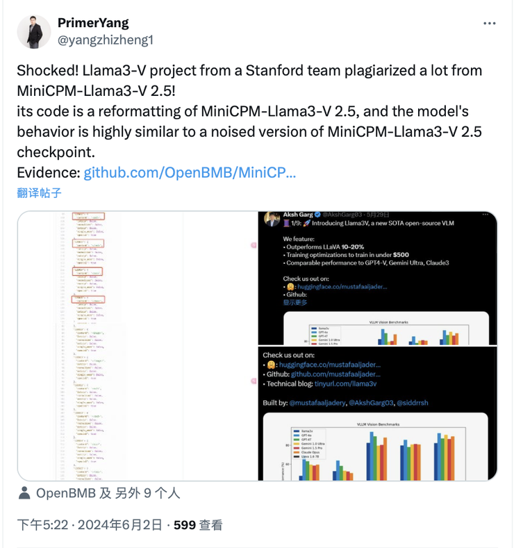 6 月 2 日下午,该事件开始在推特上发酵,MiniCPM-V 的作者亲自发帖,表示「震惊」,因为斯坦福的 Llama3V 模型居然也能识别「清华简」。
