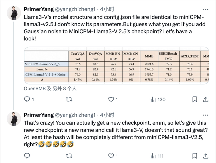 但很快,没过几天,推特与 Hugging Face 上就开始出现怀疑的声音,质疑 Llama3V 套壳面壁智能在 5 月中旬发布的 8B 多模态小模型 MiniCPM-Llama3-V 2.5,且没有在 Llama3V 的工作中表达任何「致敬」或「感谢」 MiniCPM-Llama3-V 2.5 的声音。