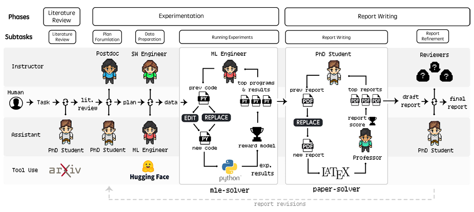 系统的核心是一个多智能体协作框架,包括多个专业化的语言模型代理:PhD 代理负责文献综述和研究规划,Postdoc 代理负责实验设计和结果解释,ML 工程师代理专注于代码实现,Professor 代理则负责论文评审和质量控制。