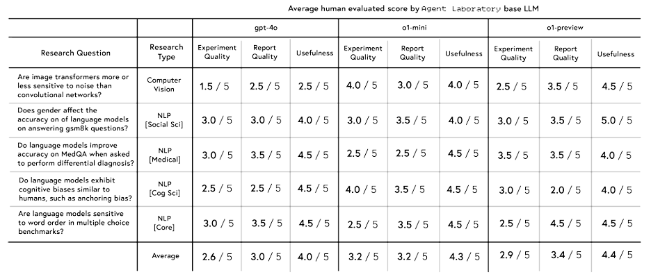 研究团队通过多维度实验评估了 Agent Laboratory 的性能。在模型对比中,o1-preview 在有用性方面表现最佳,评分达到 4.4/5;在报告质量方面得分为 3.4/5,与 o1-mini(3.2/5)相近;o1-mini 在实验质量方面领先,得分为 3.2/5;而 gpt-4o 虽然在各项指标上表现较弱,但其运行成本显著降低,每篇论文仅需 2.33 美元,比现有自动化研究方法节省 84%。