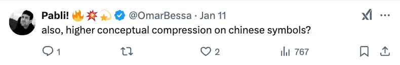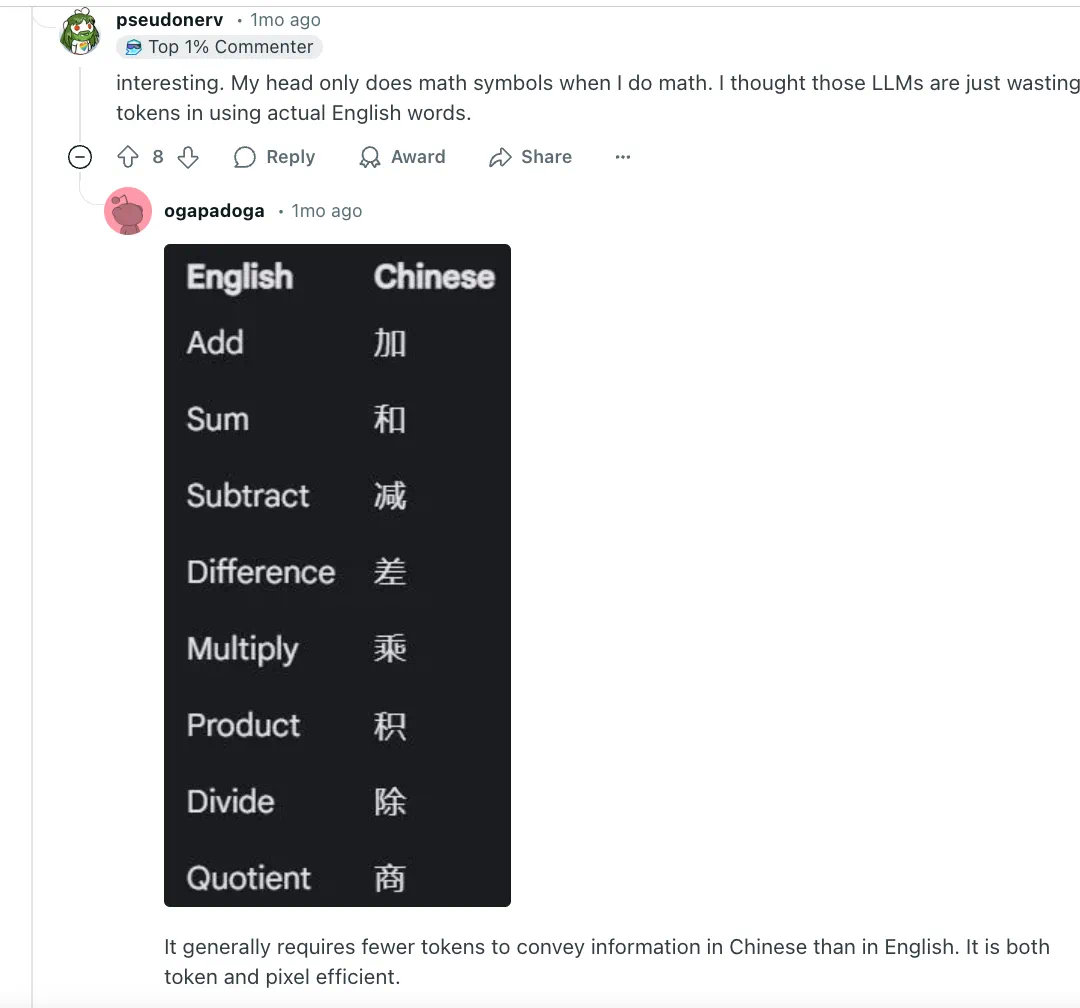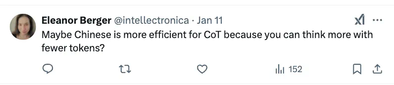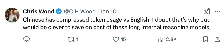 「与英语相比,中文压缩了 token 的使用。我怀疑这是否是原因,但节省这些冗长的内部推理模型的成本是明智之举。」