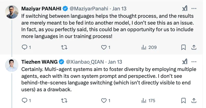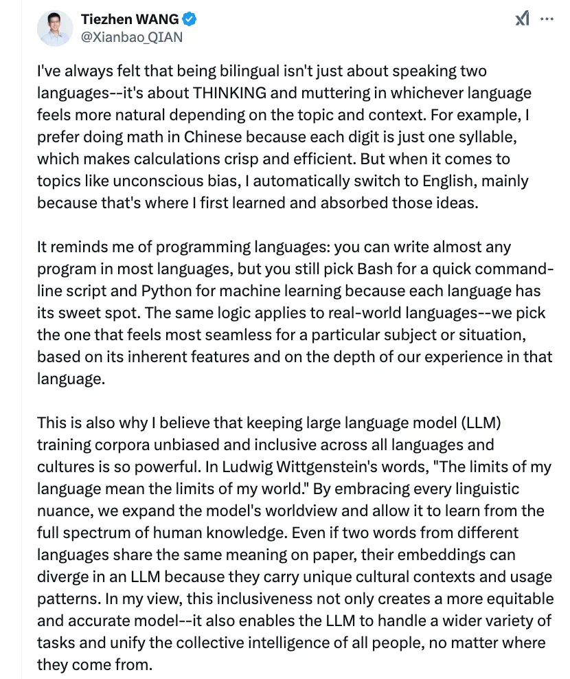 「作为一个中国人,我经常在脑子里用英文思考,因为我是双语者。所以我一点也不惊讶大语言模型会用中文思考,毕竟它们也是多语言通。只要最后输出的是预期语言就行,我觉得这不能算是幻觉。不过,这是不是要进一步思考: