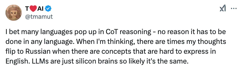 「在思维链推理过程中,肯定会冒出很多种语言,用哪种语言思考都行。就像我自己,当某些概念用英语很难表达时,我的思维就会自动切换到俄语。大语言模型就是硅基大脑,可能也是同理。」