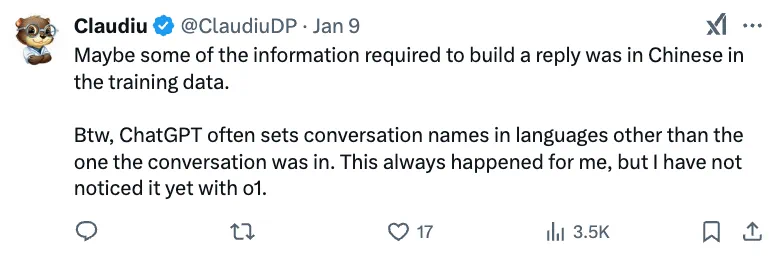 软件工程师 @ClaudiuDP 也表示:「可能是 AI 的训练数据中里,一些需要用来构建回答的信息是用中文写的。」