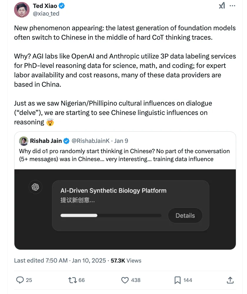 然而,有些专家并不认同应该让数据标注背锅。因为除了中文,o1 突然切换到印地语、泰语等其他语言的可能性也很大。