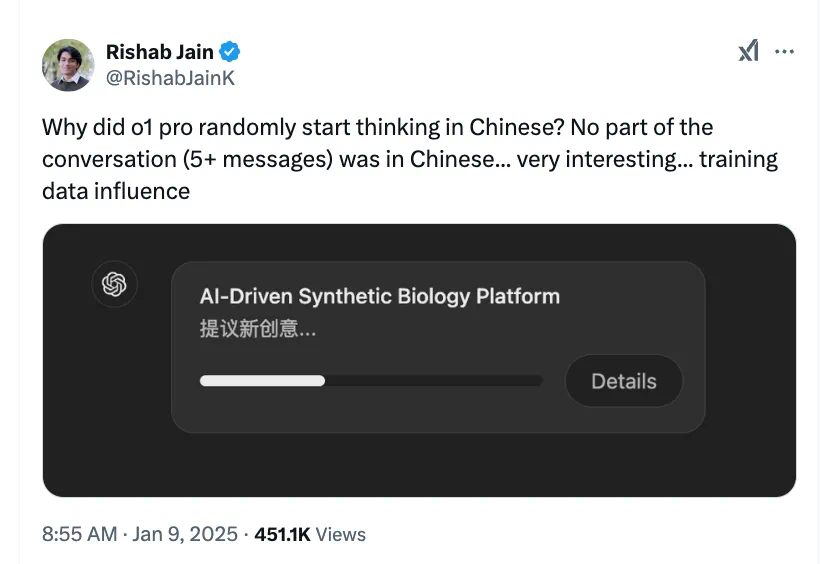 神经科学 × AI 研究员 Rishab Jain 也在 X 上表示疑惑:「为啥 o1 突然开始用中文思考了?明明整个对话(5 + 条消息)都是英文啊…… 很有意思…… 该不会是训练数据在作祟吧?」