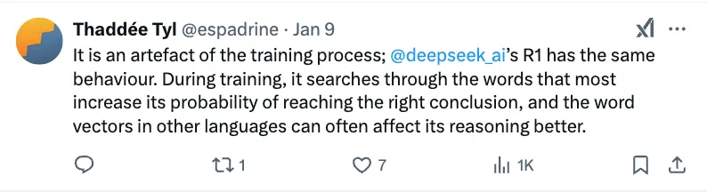 「这是训练过程中产生的一个现象。Deepseek 的 R1 模型也有同样的表现。在训练过程中,模型会搜索那些最能帮助它得出正确结论的词。而其他语言中的词向量往往能更好地影响它的推理过程。」