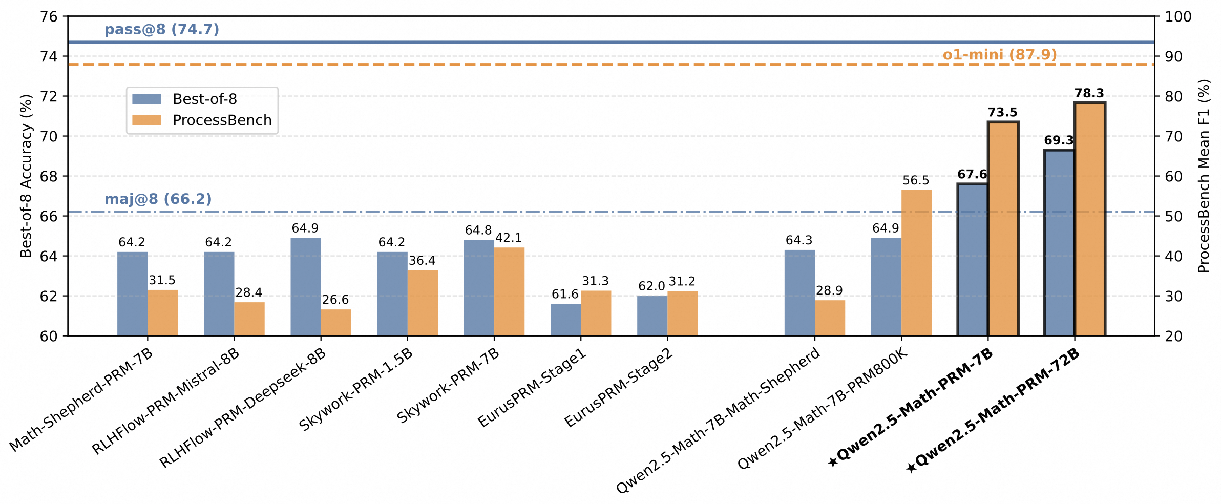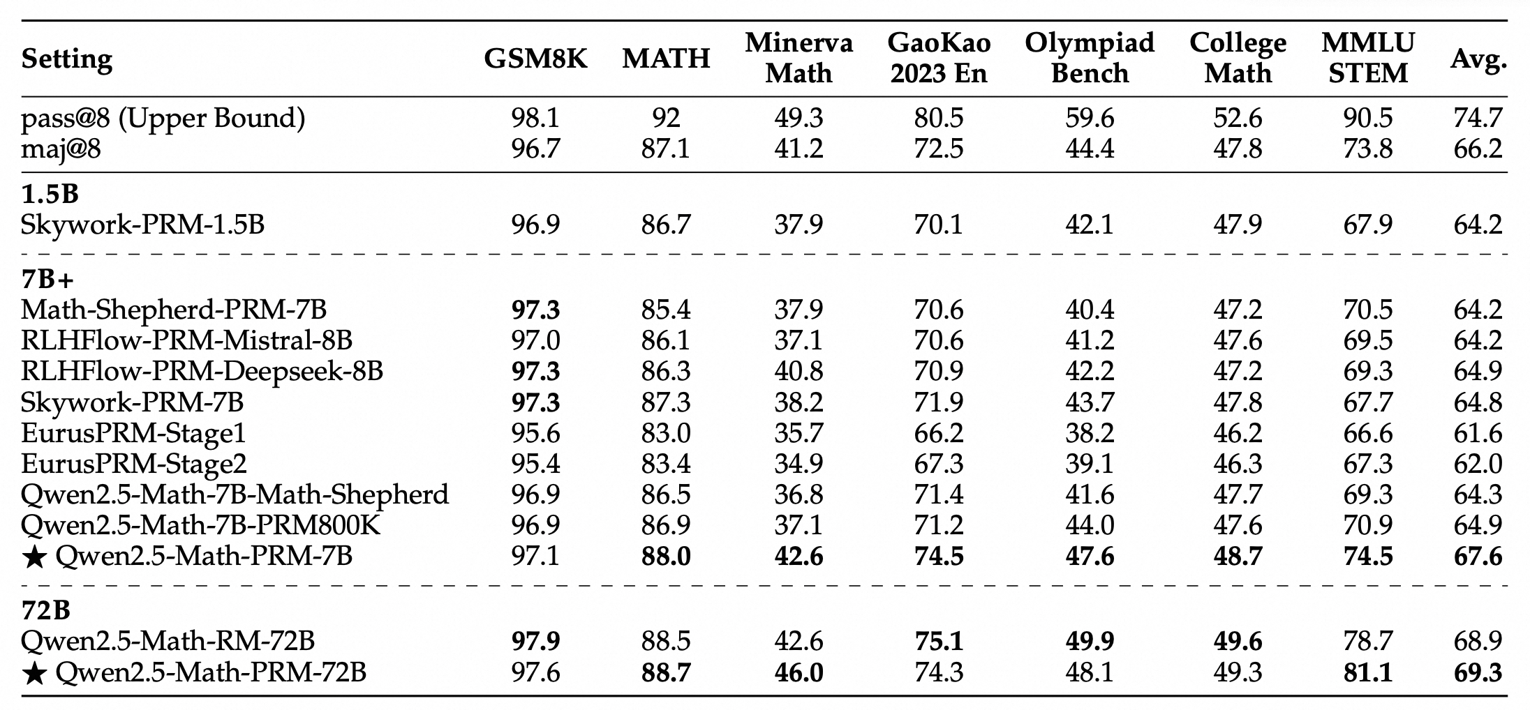 在包含GSM8K、MATH、Minerva Math等7个数学基准测试的 Best-of-N 评测中,Qwen2.5-Math-PRM-7B性能表现超越了同尺寸的开源PRMs;Qwen2.5-Math-PRM-72B的整体性能在评测中拔得头筹,优于同尺寸ORM(Outcome Reward Model )结果奖励模型Qwen2.5-Math-RM-72B。
