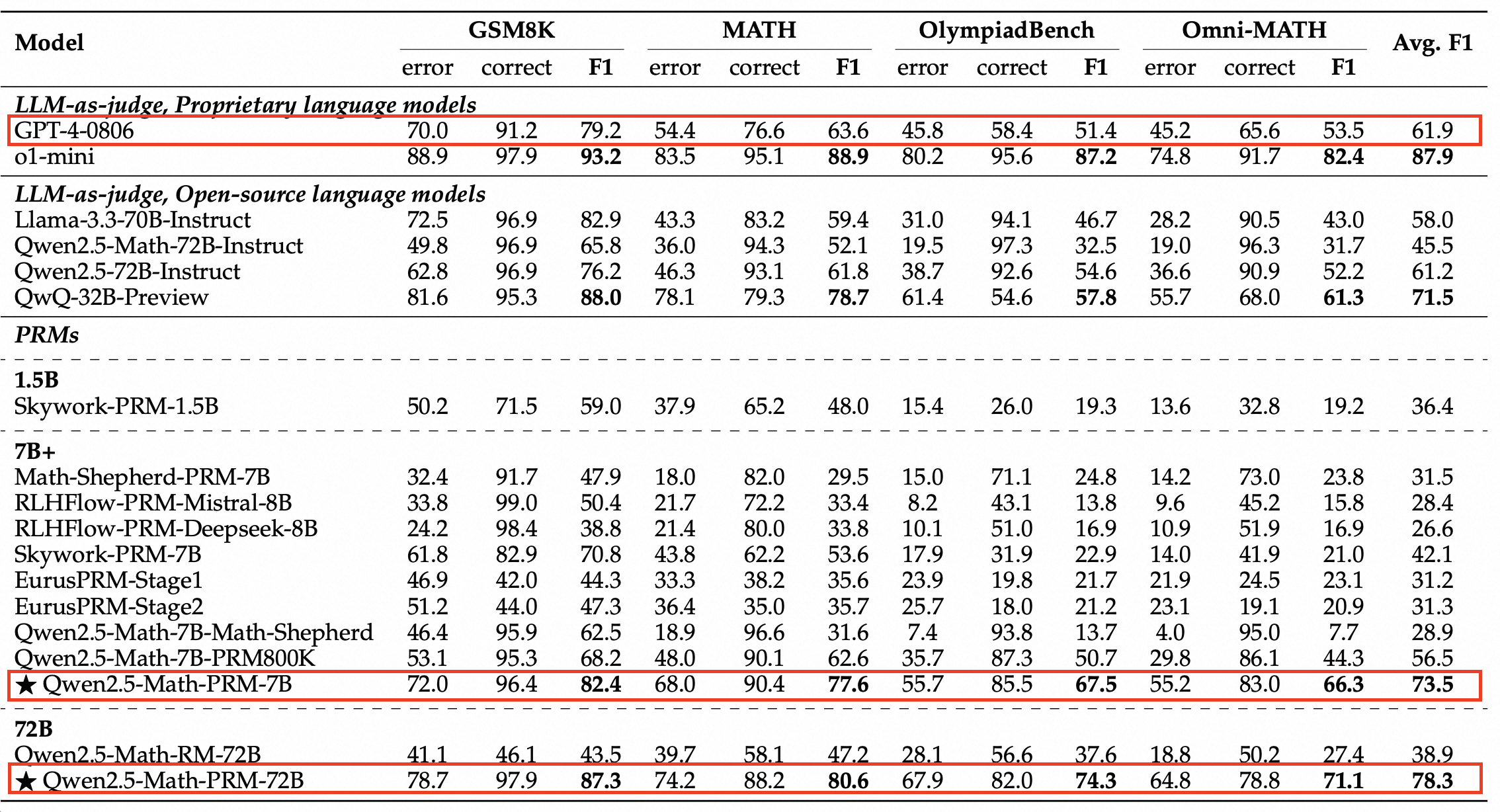 在ProcessBench上对错误步骤的识别能力的评估中,72B及7B尺寸的Qwen2.5-Math-PRM均显示出显著的优势,7B版本的PRM模型不但超越同尺寸开源PRM模型,甚至超越了闭源GPT-4o-0806。这印证了过程奖励模型PRM可有效提升推理可靠性,对未来推理过程监督技术的研发提供新思路。