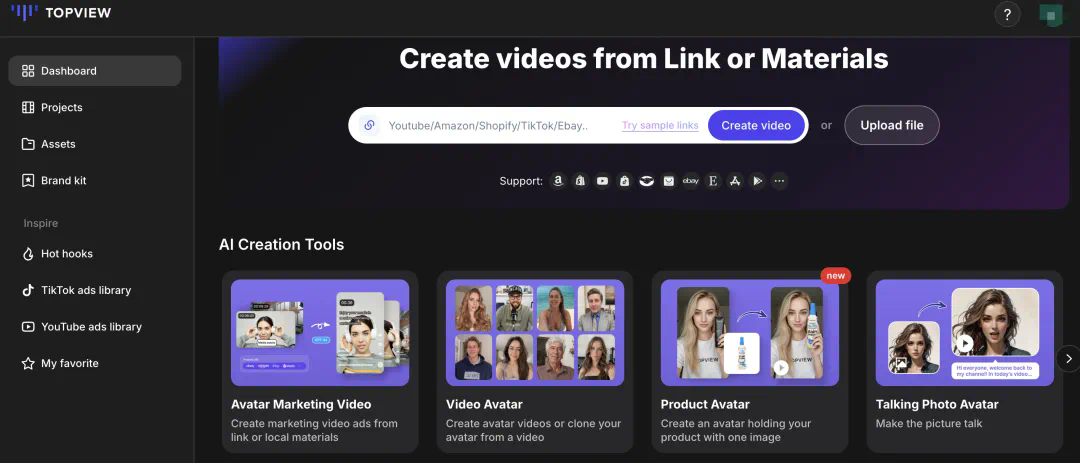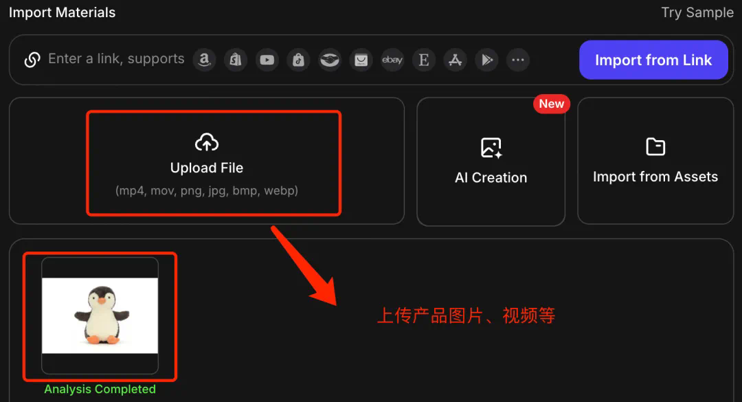 点击「Create Video」或「Upload file」即可进入操作界面,然后上传产品图片、视频或者是购物平台链接。