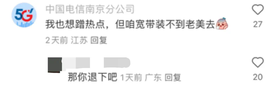 中国电信南京分公司净说心里话:我也想蹭热点,但咱宽带装不到老美去。