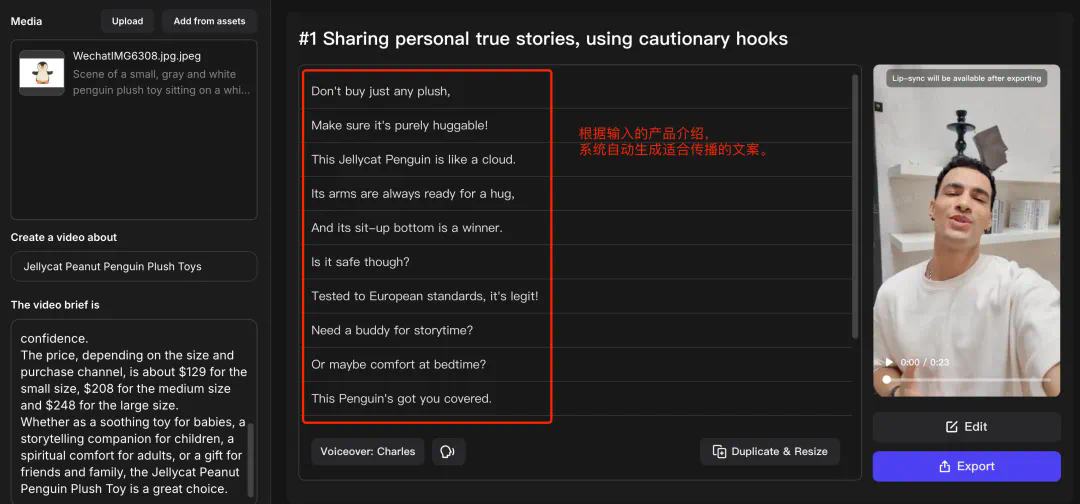 以上操作全部完成后,该应用会根据输入的产品介绍,自动攒一段适合社交媒体传播的视频文案,并生成一则带货视频。