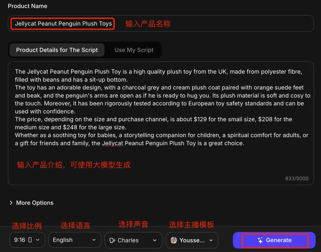 接着输入产品名称和介绍,如果觉得麻烦,也可以使用 Kimi、豆包等大模型来生成产品介绍。最后选择视频比例、语言、音色以及主播。