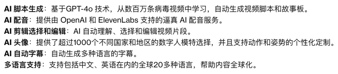 它利用先进的 AI 技术,包括 GPT-4o 来生成脚本,并学习 TikTok 和 YouTube 的成功广告,最终生成高质量的病毒式营销视频。