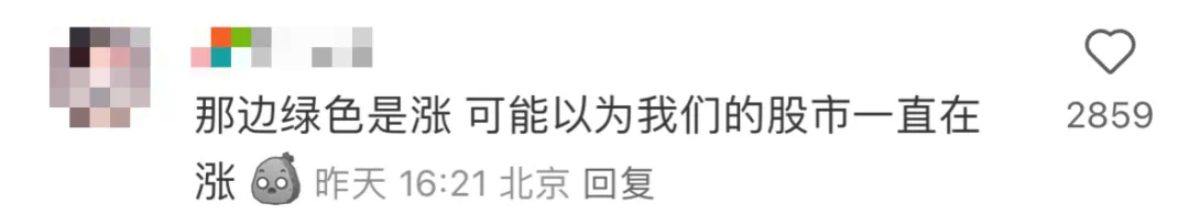 更搞笑的是,有人「骗」美国网友来买中国股票,因为美国绿色是上涨,中国股票每天都是绿色的,收益惊人: