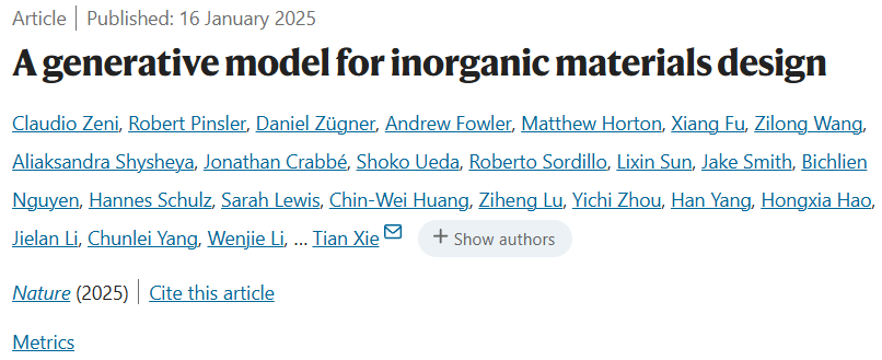 该研究以「A generative model for inorganic materials design」为题,于 2025 年 1 月 16 日发布在《Nature》。
