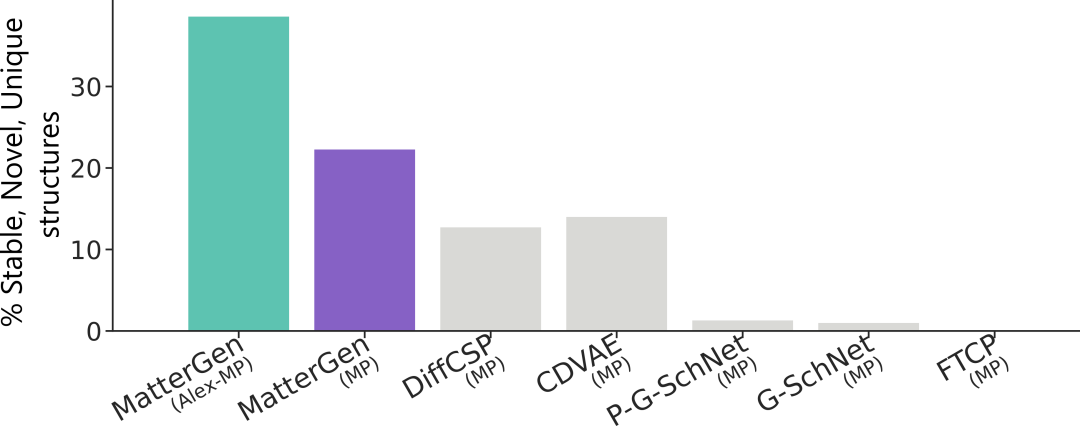 图示:MatterGen 和其他方法在生成稳定、独特和新颖结构方面的性能。(来源:论文)