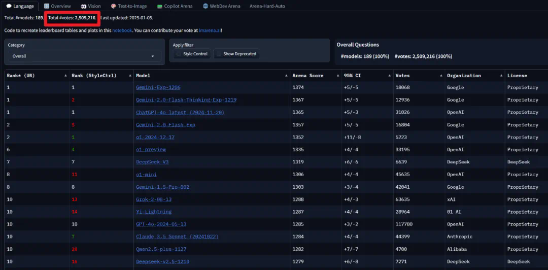 作为一家专业的人工智能媒体,AI 竞技场我们熟呀。目前 AI 领域最热门的竞技场当属 LMSYS Org 的 Chatbot Arena,其玩法也很简单:评估者与两个匿名模型互动,然后盲评这两个模型给出的响应。根据评估者反馈的胜负情况,LMSYS Org 还制作了一个动态更新的排行榜。可以看到,目前 Chatbot Arena 语言模型板块已经积累了 250 余万投票,同时暂居冠亚军的都是 Gemini 模型。