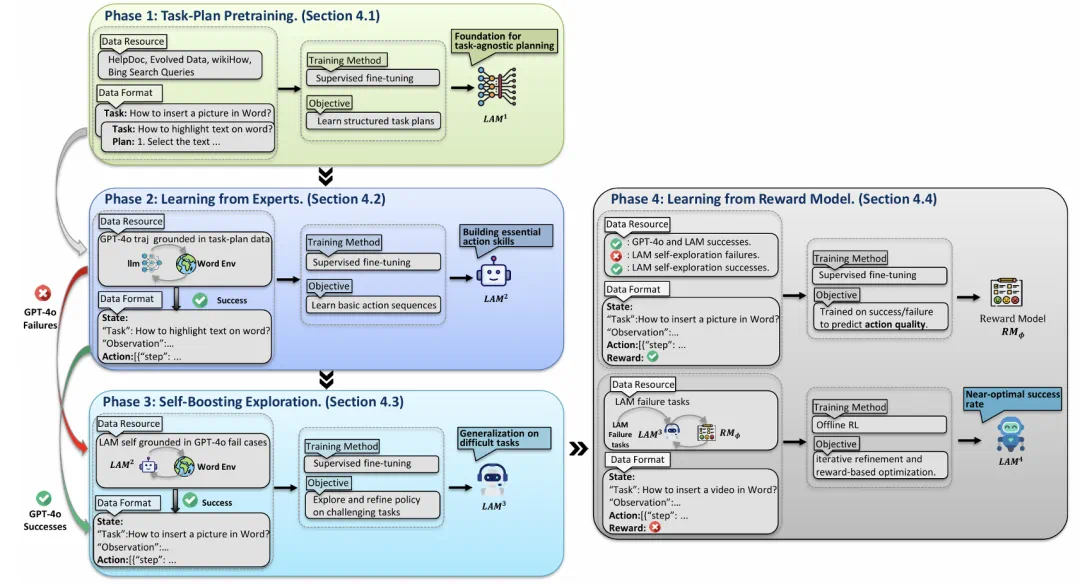 针对上述挑战,微软团队首次提出并实现了一套完整的从 0 到 1 训练 LAM 模型的流程,涵盖了从数据积累、模型训练到实际部署的所有步骤。